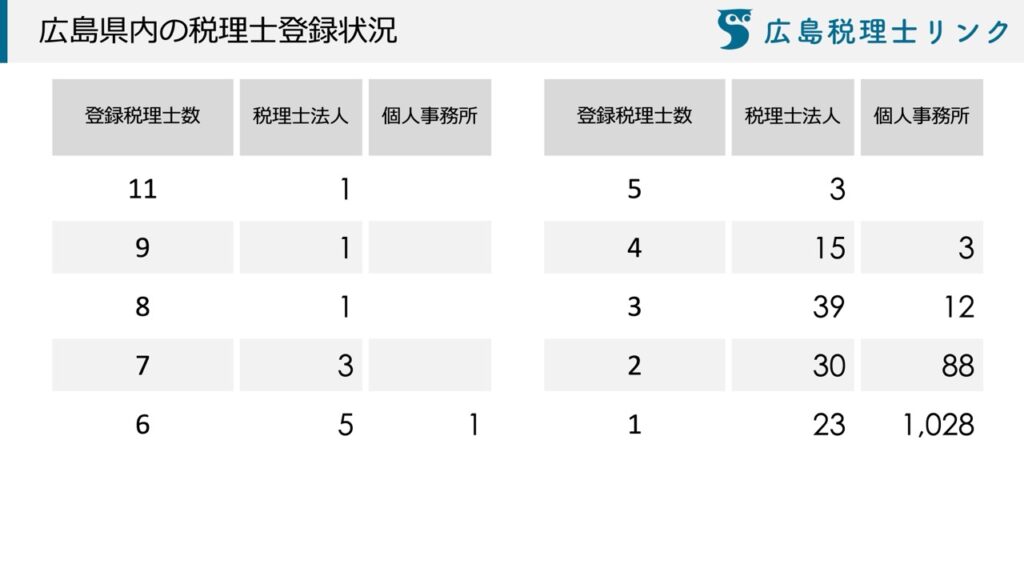 事務所としては税理士法人が121、個人事務所が1,132でした。同じ税理士法人で広島県内に複数の支部がある場合も1とカウントしています。