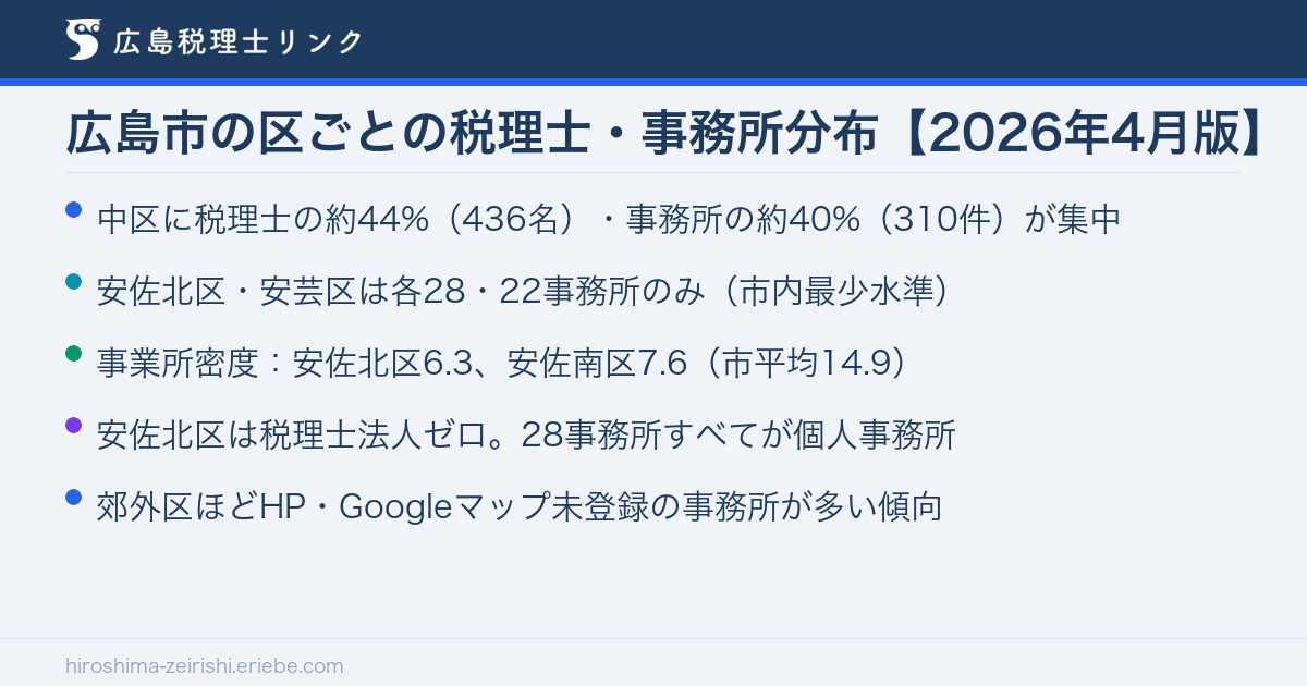 全事業所数は、総務省・経済産業省が実施した令和3年経済センサス‐活動調査(2021年6月1日時点)の広島市区別データを使用しています(出典:令和3年経済センサス‐活動調査結果(産業横断的集計) – 広島市)。税理士データ(2026年)と事業所数データ(2021年)は調査時点が異なるため、密度の数値はあくまで参考として解釈してください。