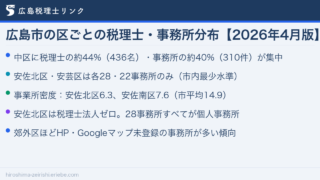 広島市 広島市の区ごとの税理士・事務所分布【2026年4月版】 広島市内で税理士を探すとき、どのエリアに事務所が多く、どのエリアが少ないのかを把握しておくと探しやすくなります。2026年4月時点のデータをもとに、広島市内8区の税理士数・事務所数の分布を整理しました。また、令和3年経済センサス‐活動調査(... 2026.04.24 広島市